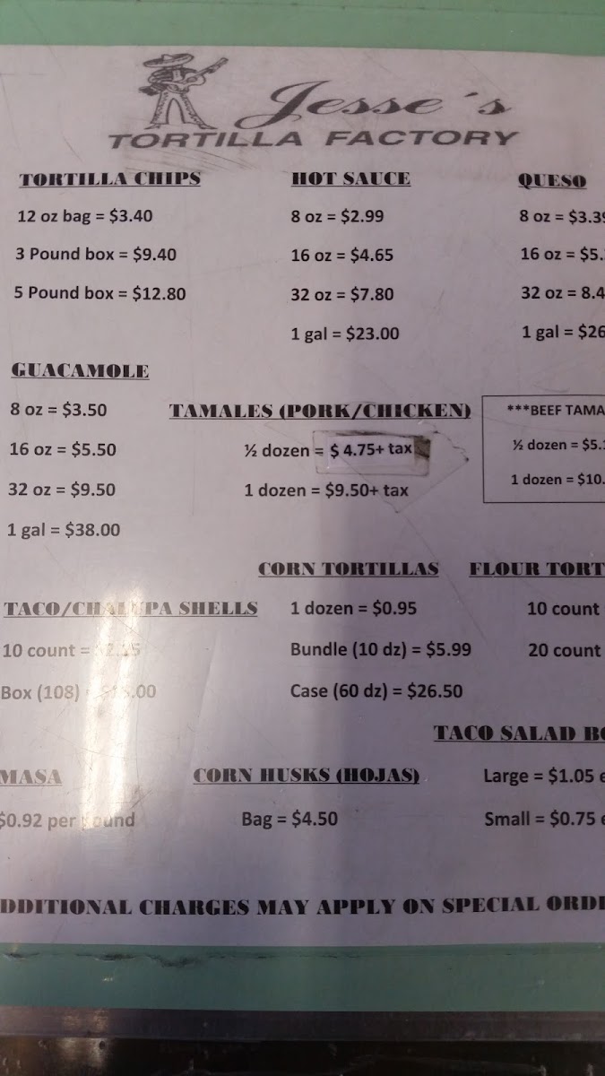 The menu at Jesse's showcases a variety of homemade offerings, with customer favorites including Chicken and Pork Tamales, renowned for their rich flavors. Don't miss their freshly made flour tortillas and crispy chips paired with vibrant salsa.